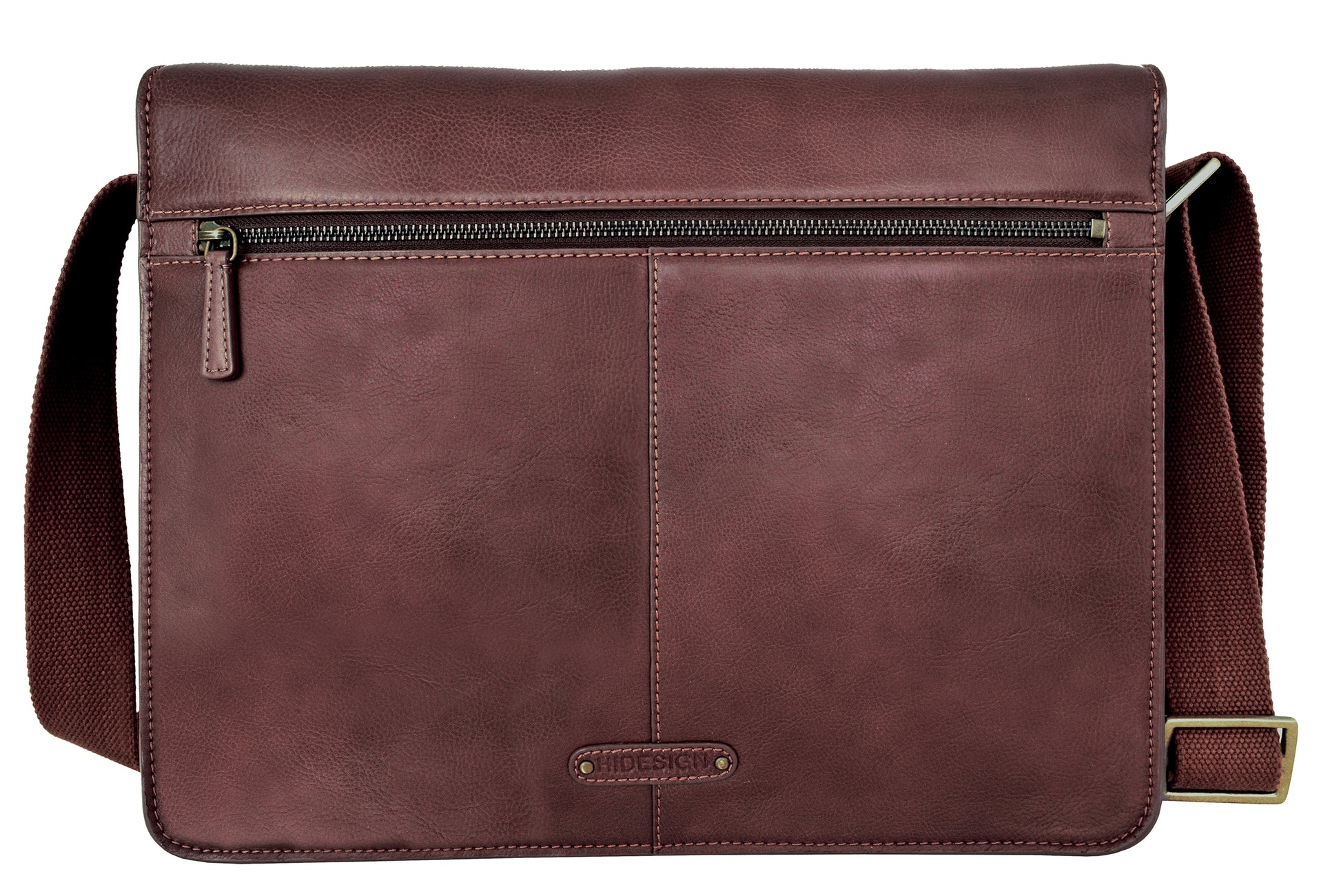A simple and contemporary leather messenger for everyday use. Casual canvas webbing shoulder strap is comfortable and adjustable. Large enough to fit a 15" laptop. Leather: Hidesign's unique full grain vegetable tanned Classic leather. Lining: Hidesign's signature 100% cotton green striped lining. Closure: Magnetic snaps. Handles & Strap: Adjustable canvas webbing shoulder strap. Interior Details: Two interior compartments, one slip compartment and one main compartment. The main compartment has a dedicated space for an iPad or small tablet, one zip pocket and one slip pocket. Measurements: 14.9"L x 11.4"H x 3.1"W