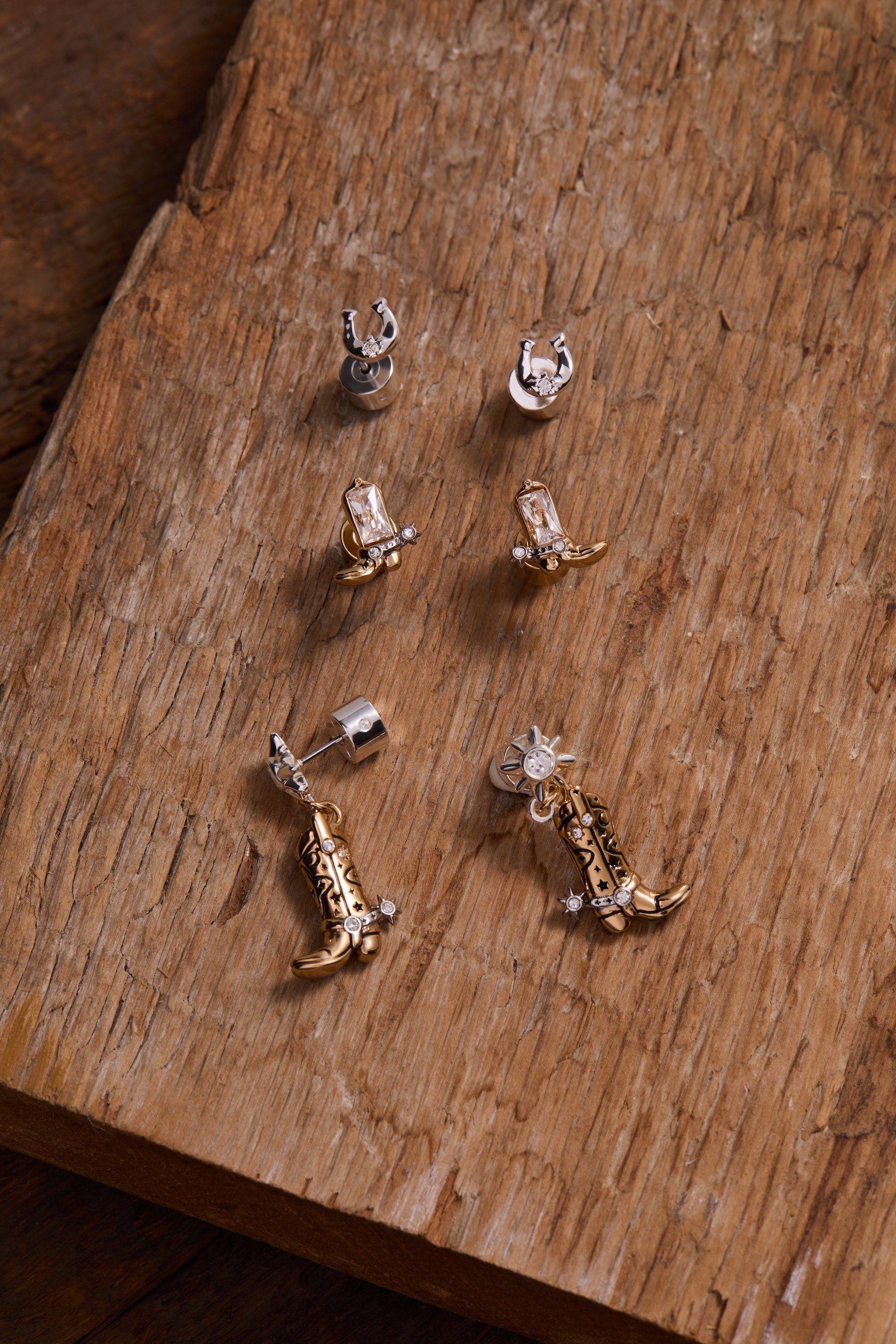 A playful mix of western charm and celestial sparkle, the Cosmic Cowgirl Stud Set features mismatched horseshoe and cowboy boot studs in mixed gold and silver tones. Crystal details add just the right hint of shine, making these earrings easy to dress up or down. Whimsical yet refined, they bring personality to everyday looks while still feeling polished and intentional.