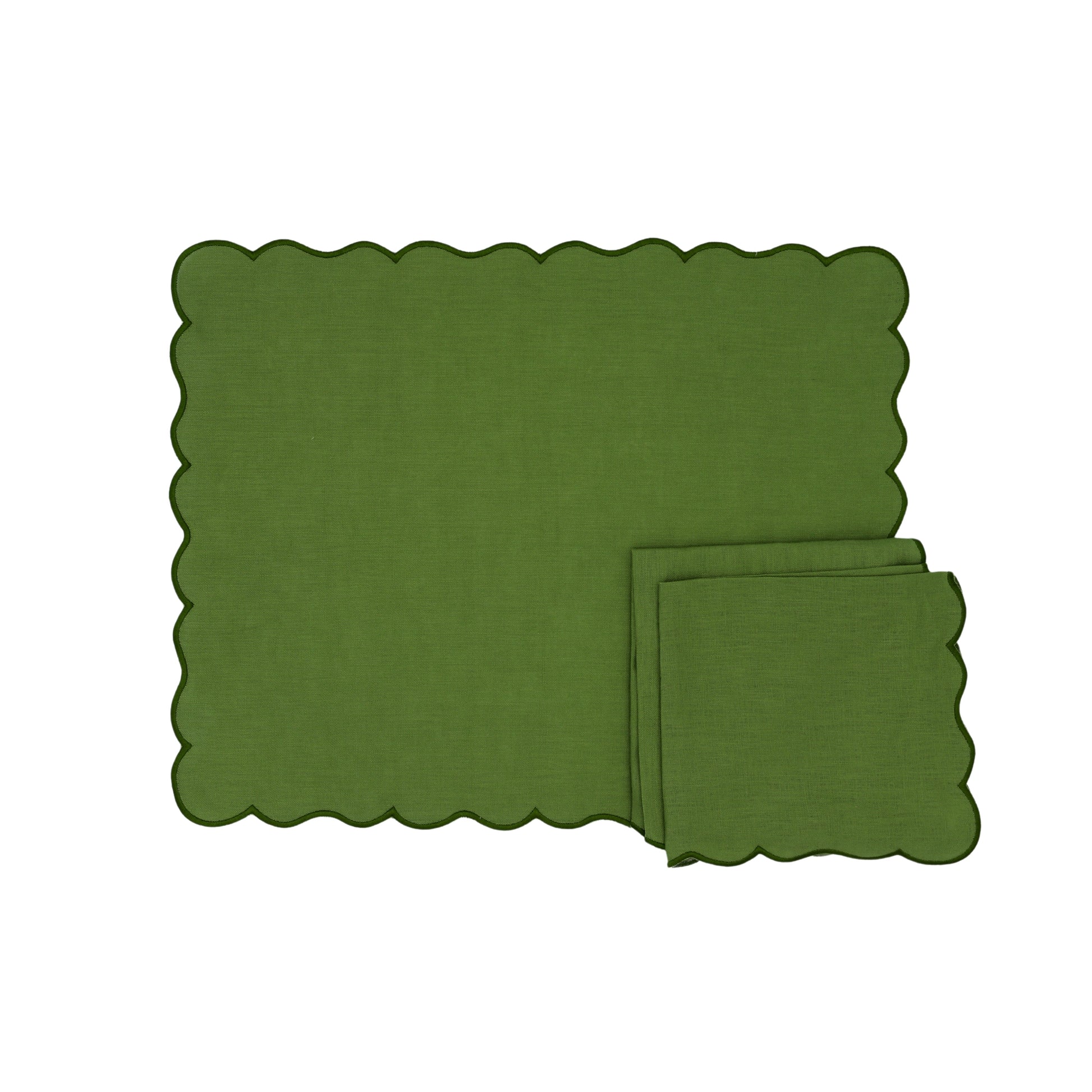 Our evergreen Wave Placemat is a contemporary addition that exudes timeless charm, with a soothing English green shade and a wavy embroidered edge. Pair it seamlessly with our coordinating tableware