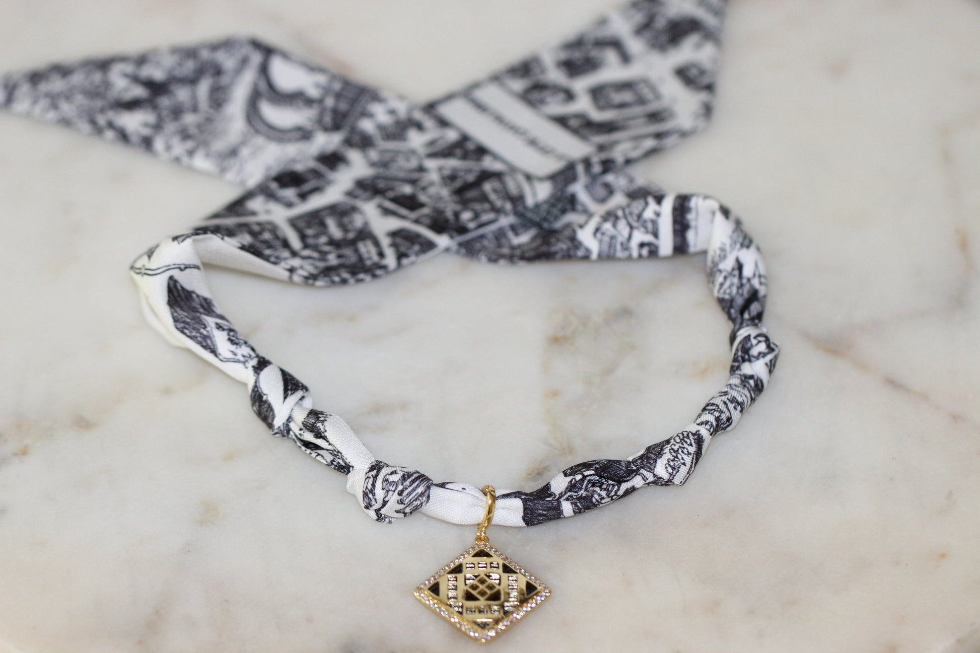 Bold, architectural, and dripping in modern class—the Metropolitan Luxe scarf necklace features a black and white city print scarf finished with a gold and black geometric pendant. A nod to New York’s high-rises and timeless grid, this piece elevates everyday looks with ease.