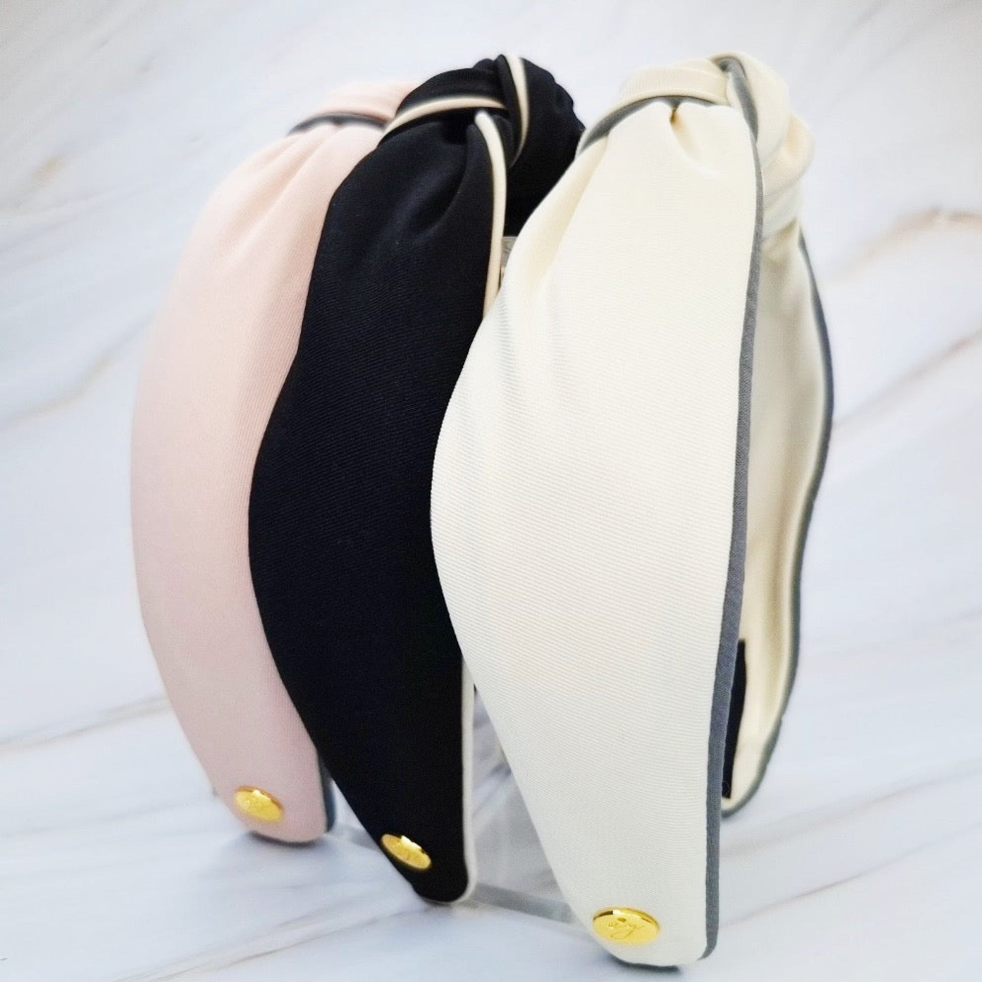 Elevate your everyday style with this chic piped preppy headband, designed to add a polished, collegiate-inspired touch to any look. Its softly structured silhouette holds hair comfortably in place while maintaining that clean, effortless aesthetic Viva Bene is known for. The contrast piping brings a timeless detail that transitions seamlessly from casual outings to more refined moments. Lightweight and gentle on the hair, it’s the perfect accessory for pulling your look together with ease and intention.